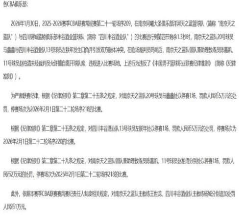 時隔1天后,北京時間2月1日,CBA聯(lián)賽針對這次沖突,開出了本賽季至今為止最大的一張罰單,CBA公司以“馬鑫鑫與左朕年發(fā)生口角并引發(fā)雙方肢體沖突,在臨場裁判員鳴哨后,助教陳嘉凱、趙柏清未經(jīng)裁判員允許擅自離開球隊席,違規(guī)進入比賽場地”為由,分別對左朕年、馬鑫鑫、趙柏清以及同曦助教陳嘉凱處以重磅處罰。