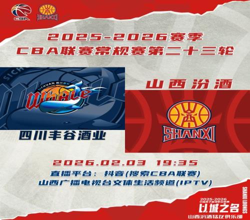 北京時間2026年2月3日19:35,2025-2026賽季CBA聯賽常規(guī)賽第23輪繼續(xù)進行,山西汾酒客場挑戰(zhàn)四川豐谷酒業(yè),球迷觀眾可以通過抖音(搜索CBA聯賽)、山西廣播電視臺文體生活頻道(IPTV)觀看比賽實況,與我們一同為山西汾酒男籃加油助威!