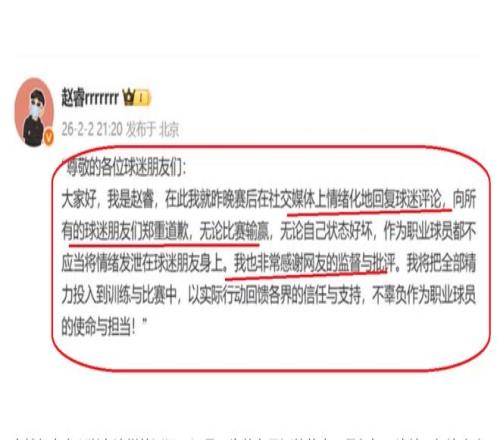 晚上9點(diǎn)!趙睿發(fā)文,向球迷道歉