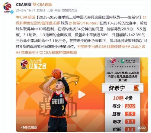 北京時間2月6日,CBA官方公布2025-26賽季第二期月度獎項,深圳男籃一戰(zhàn)封神——山東濟南小伙賀希寧當(dāng)選月度最佳...