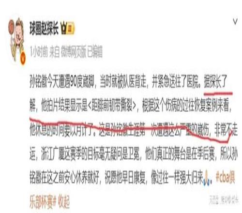 當然,真正糟糕的是,在比賽開場不久后,廣廈的核心后衛(wèi)孫銘徽便意外受傷。根據(jù)現(xiàn)場畫面來看,孫銘徽是在一次突破中,誤踩了迪亞洛的腳,意外崴腳。在談到這一次崴腳時,孫銘徽毫不避諱的表示,這是他職業(yè)崴腳最嚴重的一次。隨后,他被隊友背著離開賽場。賽后,根據(jù)知情人士透露,孫銘徽這一次傷到了距腓前韌帶撕裂,將會缺席接下來的比賽。而對于孫銘徽會缺席多久,根據(jù)該知情人士透露,孫銘徽此次傷停,恐怕會以月計。