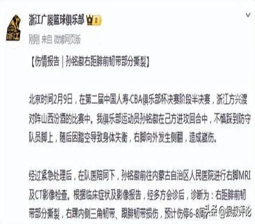 北京時間2月11日,根據(jù)廣廈男籃官方社媒公示,孫銘徽右距腓前韌帶部分撕裂,預計將會傷停6-8周。 具體原文如下:在...