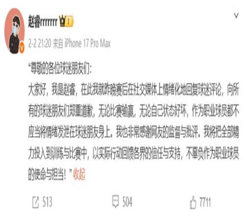 這場(chǎng)風(fēng)波迅速發(fā)酵,其嚴(yán)重性遠(yuǎn)超普通的口水仗,由于涉及對(duì)特定地域及群體的不當(dāng)表述,事件很快突破了籃球范疇。據(jù)媒體報(bào)道,新疆官方媒體甚至下場(chǎng)發(fā)文,以嚴(yán)厲措辭痛斥趙睿的言論嚴(yán)重傷害了新疆人民情感,那么在如山壓力之下,趙睿于2月2日晚間通過(guò)個(gè)人社交媒體公開(kāi)發(fā)文道歉。