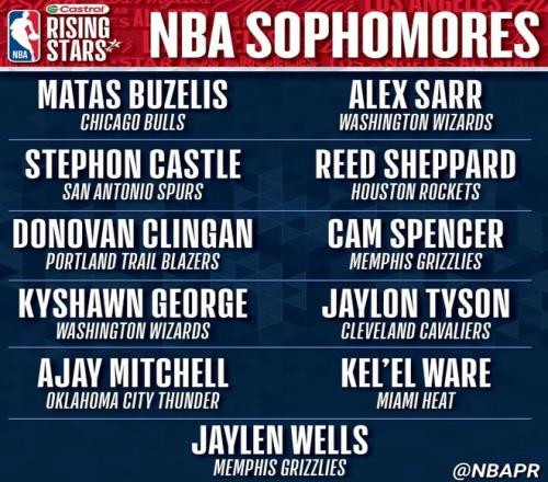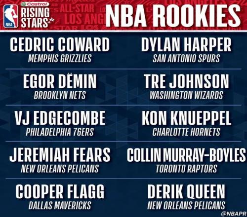 入選NBA全明星新秀賽的一年級球員, 總共有10人,分別是弗拉格(獨行俠)、克尼佩爾(黃蜂)、埃奇庫姆(76人)、科沃德(灰熊)、奎因(鵜鶘)、特雷-約翰遜(奇才)、哈珀(馬刺)、博伊爾斯(猛龍)、杰明(籃網(wǎng))和費爾斯(鵜鶘)。