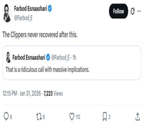 賽后隊(duì)記Farbod Esnaashari坦言:“這是一次非常離譜的吹罰,這對快船隊(duì)打擊巨大,自那之后,快船隊(duì)就再沒緩過來?!?/p>