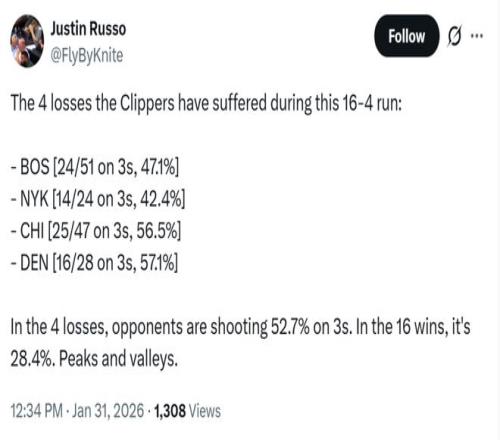 而對手三分投射的命中率也是快船隊(duì)過去20場比賽的勝負(fù)手,當(dāng)快船隊(duì)取勝時(shí)對手三分命中率僅為28.4%,輸球時(shí)對手的三分命中率則高達(dá)52.7%。