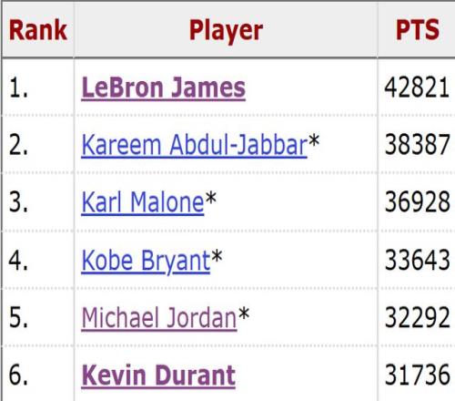 作為15屆全明星、4屆得分王、2屆NBA總冠軍、2屆總決賽MVP以及1屆常規(guī)賽MVP,杜蘭特目前以31736分的總得分位列歷史得分榜第六位,僅次于勒布朗-詹姆斯、阿卜杜爾-賈巴爾、卡爾-馬龍、科比-布萊恩特以及邁克爾-喬丹。
