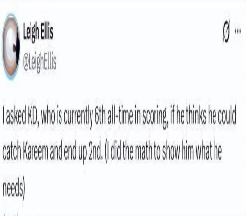 NBA記者埃利斯通過計(jì)算后告知杜蘭特:要想超越賈巴爾,成為歷史得分榜的第二,杜蘭特需要在接下來出戰(zhàn)的268場(chǎng)比賽中,保持場(chǎng)均25分的水準(zhǔn)。