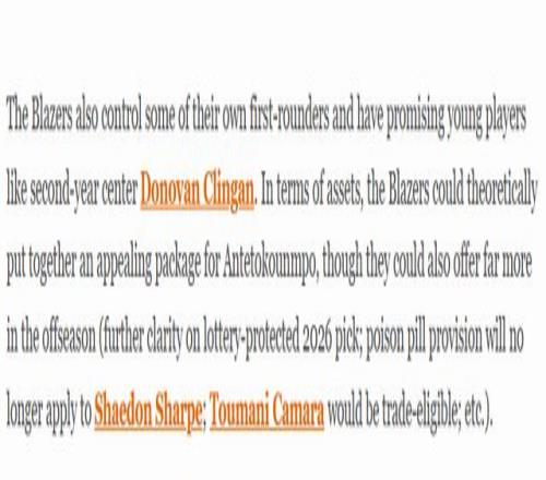 此外,開拓者還握有部分自家首輪簽,隊中也不乏潛力新星,例如二年級中鋒克林根。從籌碼層面來看,開拓者理論上能夠為得到字母哥拼湊出一份頗具吸引力的交易方案,不過到了休賽期,他們能拿出的籌碼還會更加豐厚(2026年受樂透保護的首輪簽歸屬將更加明確;謝登-夏普合同中的毒藥條款將失效;圖馬尼-卡馬拉將具備交易資格,等等)。