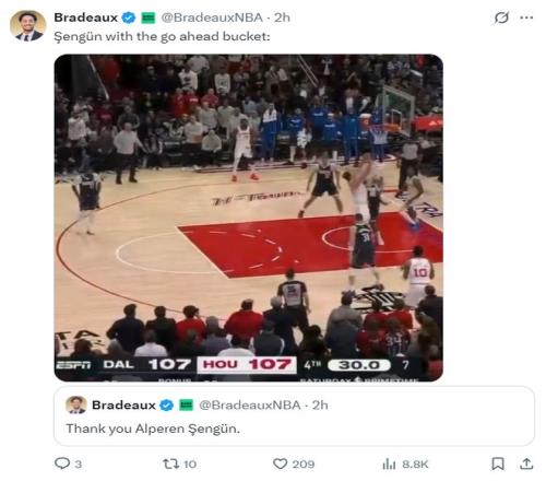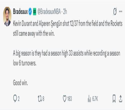 賽后火箭記者Bradeaux也為申京、杜蘭特辯護(hù),這兩人本場(chǎng)比賽37中12手感不佳,但火箭還是贏球了,因?yàn)檫@兩人合力送出15次助攻,全隊(duì)33次助攻只有6次失誤。