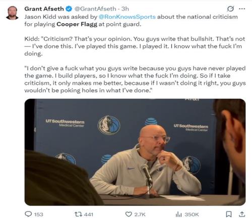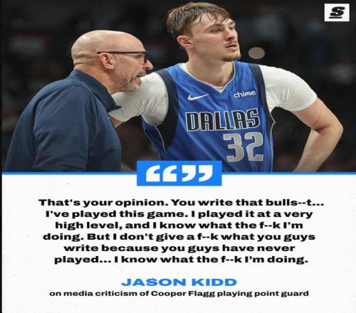 賽后記者詢問基德怎么看待賽季初讓弗拉格打PG被批判的話題,基德直接怒了,基德直接噴記者:我管你們XX怎么寫,我打球的時(shí)候就是最頂級的球員,我干這一行這么多年我根本不在乎你們怎么說、怎么寫,我TMXX清楚自己在做什么,你們愛怎么寫就怎么寫,我無所謂。
