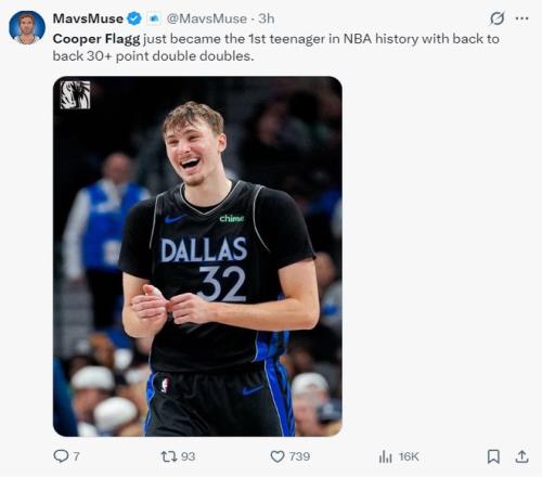 3.弗拉格成為東契奇后首位單場30+10+5的球員;