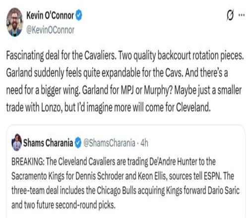 隨著賽季中期交易截止日前的臨近,公牛、國王與騎士三支球隊(duì)終于打破平靜,完成一筆3方4人交易,具體內(nèi)容如下: