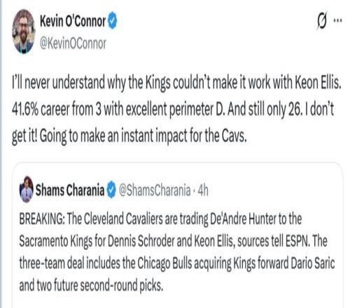 相比于身背大合同的亨特,埃利斯是廉價(jià)至極的優(yōu)質(zhì)3D球員,正如美記奧康納所說,26歲的埃利斯防守?cái)?shù)據(jù)聯(lián)盟頂尖,生涯三分命中率41.6%,很難理解為何國王不能與他愉快合作,他的加入將立即為騎士帶來顯著的影響。