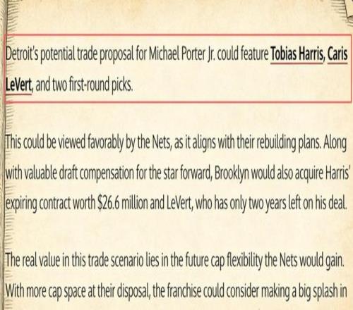 對(duì)于籃網(wǎng)而言,小波特的表現(xiàn)是他們整個(gè)低迷賽季為數(shù)不多的驚喜之一,但考慮到他的年齡,并不適合球隊(duì)的遠(yuǎn)期規(guī)劃;相比之下,吃下哈里斯和勒韋爾剩余接下來(lái)一年的合同,收獲兩個(gè)首輪簽,也算是一筆劃算的買賣。