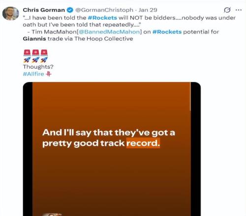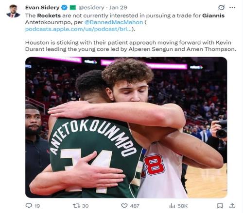 早在1月28日,ESPN記者布蘭德-麥克馬洪的播客節(jié)目中,他就說過:我只想告訴你們,揚尼斯交易火箭一事根本不可能,火箭對現(xiàn)有陣容一如既往的耐心。