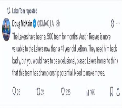 湖人記者Doug McKain賽后評論道:湖人已經連續(xù)數月勝率在50%,奧斯汀-里夫斯對湖人而言的重要性遠超過41歲的詹姆斯,湖人迫切希望里夫斯回歸,但你是個狂熱的湖人球迷認為湖人一定要奪冠,那你一定是精神錯亂或偏見了,因為這支球隊根本沒有奪冠實力,除非他們采取行動。