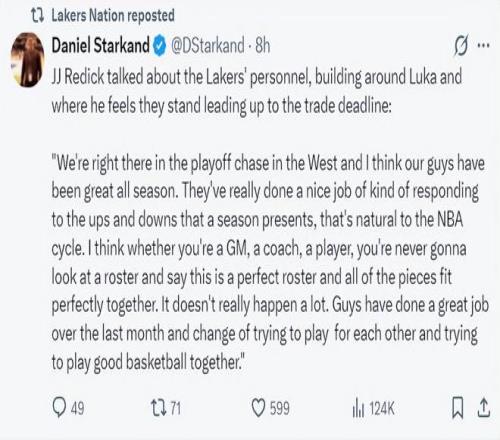 八村壘在賽后的采訪中也這樣說道:雷迪克說我們現在這套陣容已經足夠打進季后賽。只要我們的球隊能夠穩(wěn)定的配合,我們就能取得進步。(從這個角度來看湖人大概率在交易截止日前真的沒有任何運作了)
