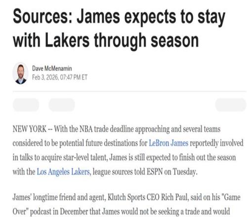 消息來自于ESPN名記Dave McMenamin,他表示數(shù)支傳言是詹姆斯下家的球隊正在進行引進球星的談判,但詹姆斯預計將在湖人打完本賽季剩余比賽。