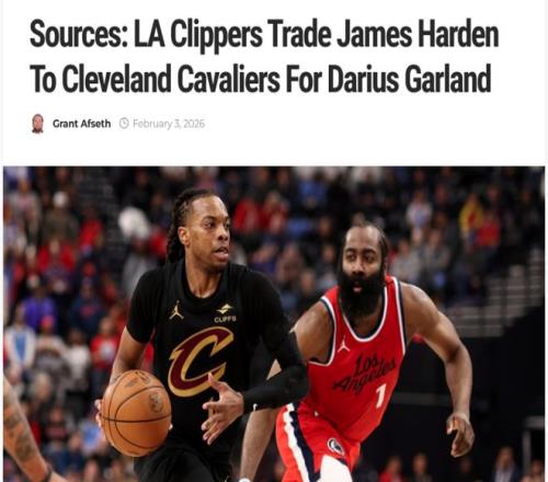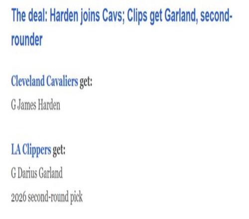 在傳出哈登向快船提出交易申請(qǐng)后不到24小時(shí),快船與騎士便迅速圍繞哈登與加蘭完成2換1交易,具體內(nèi)容為:
