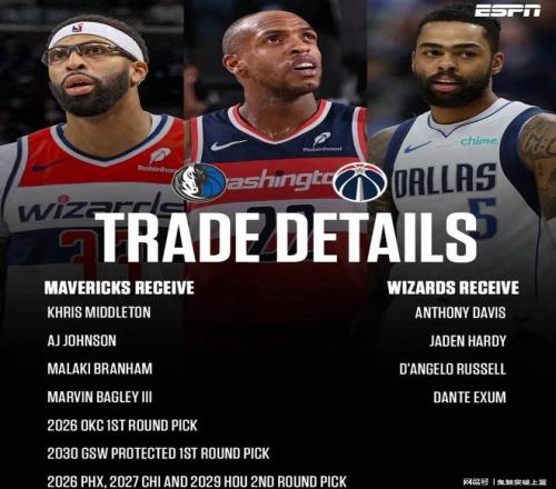 雙方達(dá)成的具體交易為:獨(dú)行俠送出安東尼戴維斯+杰登哈迪+德安吉洛拉塞爾+丹特??怂_姆,從奇才換回克里斯米德爾頓+AJ約翰遜+馬拉凱布蘭納姆+馬文巴格利+2026年首輪簽(來(lái)自雷霆)+2030年受保護(hù)首輪簽(來(lái)自勇士)+2026年次輪簽(來(lái)自太陽(yáng))+2027年(來(lái)自公牛)+2029年次輪簽(來(lái)自火箭)。