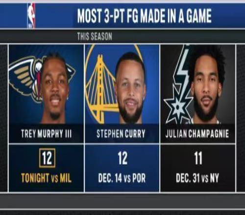 鵜鶘:墨菲12記三分44分6籃板6助攻3搶斷,三分命中數(shù)與得分均創(chuàng)生涯新高紀(jì)錄,追平庫里并列本賽季單場三分命中數(shù)聯(lián)盟第一。貝4記三分22分,錫安20分5籃板8助攻,費爾斯13分。