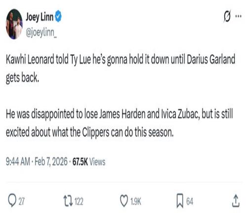 快船隨隊記者Joey Linn也曝出,小卡對于哈登與祖巴茨的離隊感到失望,但對本賽季快船隊的前景仍有期待。
