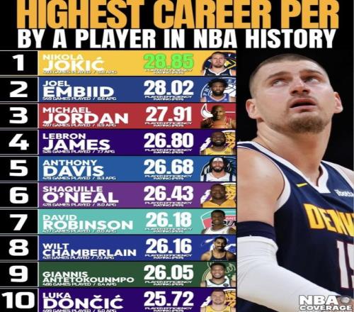 最近nba world wide coverage發(fā)布了“NBA歷史球員生涯最高球員效率值”榜單,約基奇排在第1,恩比德、喬丹緊隨...