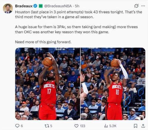 火箭記者Bradeaux寫道:火箭隊(duì)本賽季在三分出手方面是聯(lián)盟墊底,但此役出手43個三分球,這是火箭本賽季三分出手最多的一場(命中15球)。對于火箭來說三分球出手次數(shù)是一個重要的指標(biāo),最終他們比雷霆多進(jìn)1個三分就是贏球關(guān)鍵,未來火箭應(yīng)該多出手一些外線。