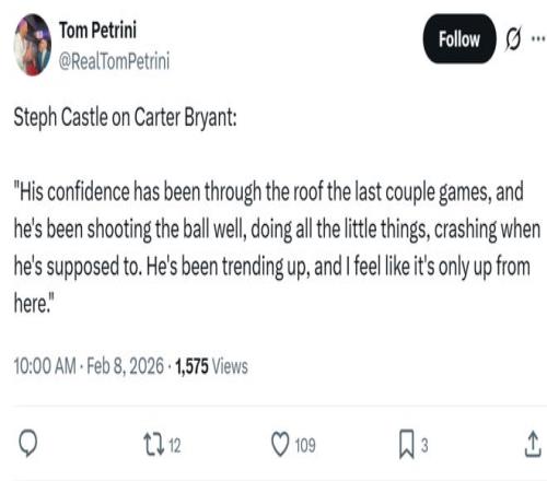 除此之外,卡斯?fàn)柗Q(chēng)贊了另外一名新星卡特布萊恩特,直言自己感覺(jué)到了他在過(guò)去幾場(chǎng)比賽信心爆棚,不僅投籃手感火熱,細(xì)節(jié)也做得很到位,他的狀態(tài)一直在提升,顯然會(huì)越來(lái)越好。