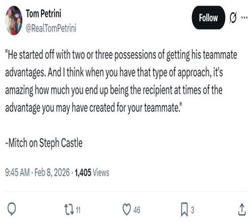 賽后文班也對(duì)卡斯?fàn)柋緢?chǎng)出色的決策能力大加贊賞到:“感覺(jué)他就像教練組一樣把對(duì)方耍得團(tuán)團(tuán)轉(zhuǎn),你懂我的意思吧?卡斯?fàn)柎虻煤芎侠?,一直在作出正確的決策,抓住對(duì)手的漏洞,讓他們付出了代價(jià)?!?/p>