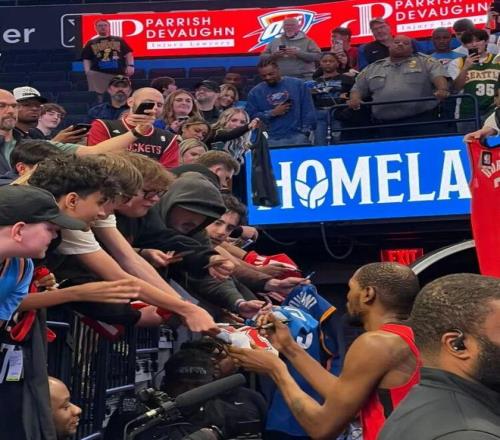 大哥心情大好,賽后戀戀不舍為俄克拉荷馬的球迷們簽名。