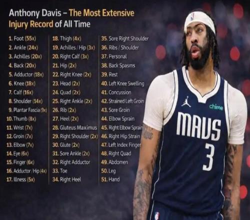 事實(shí)上,傷病一直是都是濃眉職業(yè)生涯揮之不去的陰影。這位32歲球星的傷病史足以列出一份長(zhǎng)長(zhǎng)的名單。從早期的肩部、膝蓋問(wèn)題到近年的腳踝、腹股溝和手部傷病,累計(jì)至少遭遇285次傷病,可謂是觸目驚心。