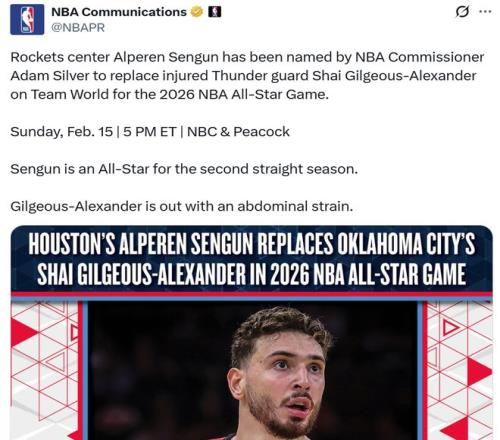 由于亞歷山大遭遇腹部肌肉拉傷,確認(rèn)無法出戰(zhàn)全明星,NBA總裁蕭華指定申京入選全明星,后者將頂替亞歷山大代表國際隊(duì)參賽。