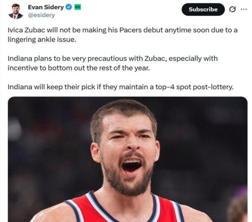 否則步行者也不會(huì)在交易截止日前大手筆引進(jìn)祖巴茨,后者在賽前被記者Evan Sidery曝出受困于腳踝傷勢(shì),短期內(nèi)不會(huì)迎來(lái)球隊(duì)首秀。