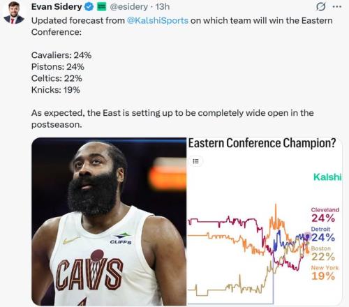 自從得到哈登后,騎士隊(duì)競(jìng)爭(zhēng)力飆升,已經(jīng)成為東部四支爭(zhēng)冠熱門(mén)之一,拿下東部冠軍的概率直接追平活塞并列東部第一。