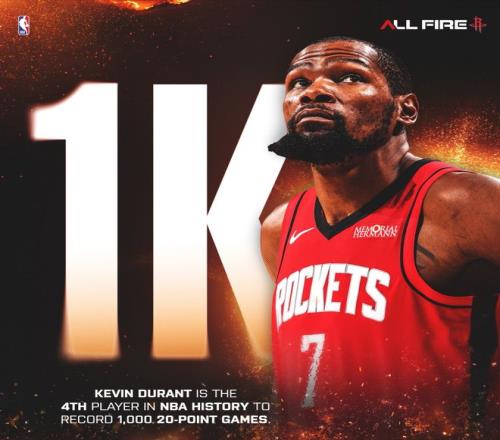 憑借這樣的表現(xiàn),杜蘭特迎來里程碑,成為NBA歷史上第4位拿下千場20+得分表現(xiàn)的球員,前三人分別是詹姆斯、卡爾馬龍和賈巴爾。
