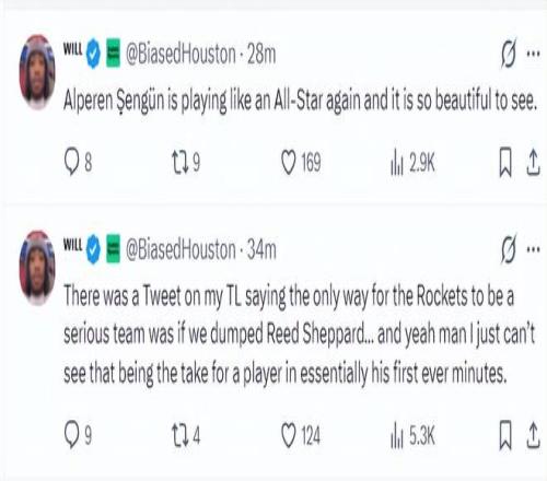 隨后他還寫道:申京現(xiàn)在又表現(xiàn)的像一位全明星球員了,看到這一幕真的太美妙了。此前還有人建議火箭放棄謝潑德,他們認為只有放棄謝潑德火箭才能成為強隊,伙計們我真的無法想象在生涯前兩個賽季就被放棄的高順位球員。