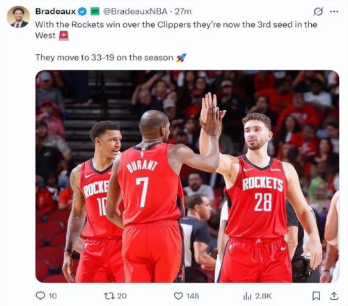 火箭升西部第3!前52戰(zhàn)33勝超去年休媒:杜蘭特并沒有讓我們更糟