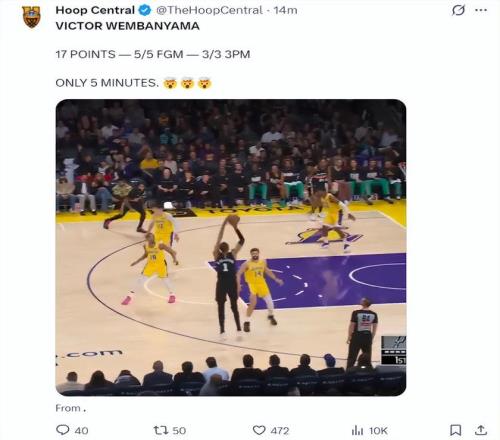 北京時間2月11日,湖人輪休多人,馬刺這邊則是全主力出戰(zhàn),維克托-文班亞馬在首節(jié)7分59秒里拿到25分,這場比賽成為文班亞馬表演賽。(科比曾在湖人主場拿到81分)