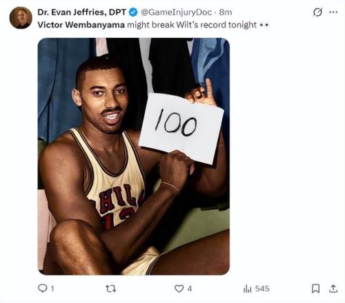 洛杉磯的醫(yī)學(xué)專家埃文-杰弗里斯:這個夜晚的文班亞馬就是張伯倫降臨。