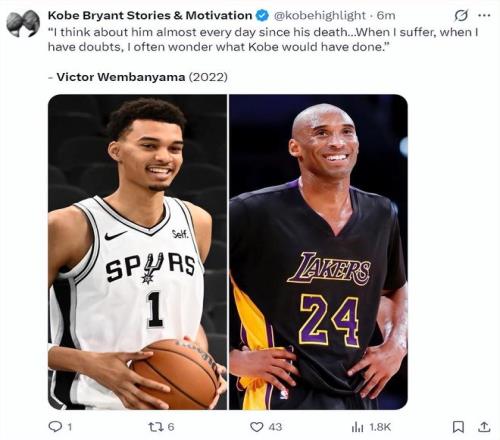 科比的球迷組織回憶了文班亞馬2022年悼念科比的言論:自從科比去世后我?guī)缀趺刻於紩肫鹚?。當我遭遇困難、產(chǎn)生疑慮時我經(jīng)常會思考科比是怎么去做的。