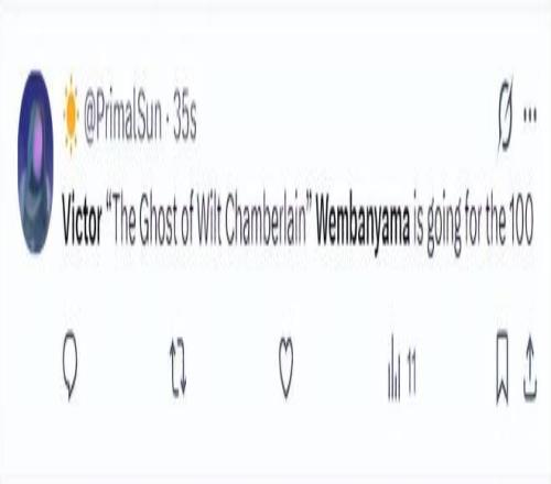 美球迷:文班亞馬這是要打破張伯倫單場100分的紀錄嗎?(8分鐘25分,那么16分鐘就是50分,24分鐘就是75分,32分鐘就是100!當然這是一種夸張的說法,文班亞馬要打破單場100分的紀錄還是很難)