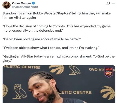 對此英格拉姆本人自然也十分開心,接受采訪時笑著說道:“我對加盟多倫多的決定感到滿意,這極大得提升了我的比賽水平,尤其是在防守端,拉賈科維奇一直在督促我變得更好,我在這里有足夠的空間展示能力,并且認為自己正在不斷進步,能夠入選全明星陣容是一項了不起的成就,一切榮耀歸于上帝?!?/p>