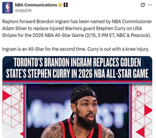 庫里因傷退出全明星,英格拉姆確認遞補入選!哈登場均轟下25+8助獲火媒、加內特力挺卻再度錯失入選全明星的好機...