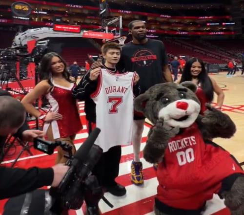 這場(chǎng)比賽之前中國(guó)娛樂(lè)明星任嘉倫來(lái)到火箭主場(chǎng)與凱文-杜蘭特進(jìn)行了互動(dòng),他為杜蘭特送上了唐裝,杜蘭特也將自己火箭7號(hào)球衣送給他,任嘉倫還表示這是按照杜蘭特2.11米的尺寸定做的,杜蘭特表達(dá)了感謝,杜小帥還說(shuō)希望跟任嘉倫一樣帥。