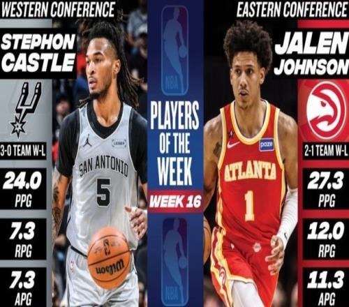 NBA官方公布了第16周的東西部周最佳球員,東部由老鷹前鋒杰倫約翰遜當(dāng)選,西部由馬刺后衛(wèi)卡斯?fàn)柈?dāng)選。杰倫約翰遜上周場(chǎng)均豪取27.3分+12籃板+11.3助攻,帶領(lǐng)老鷹取得2勝1負(fù)的戰(zhàn)績(jī)。據(jù)統(tǒng)計(jì),這是杰倫約翰遜本賽季第2次拿到周最佳球員獎(jiǎng)??ㄋ?fàn)柹现軋?chǎng)均貢獻(xiàn)24分+7.3籃板+7.3助攻,帶領(lǐng)馬刺隊(duì)取得3勝0負(fù)的戰(zhàn)績(jī)。據(jù)統(tǒng)計(jì),這是卡斯?fàn)柹氖状潍@得該獎(jiǎng)項(xiàng)。除此之外,猛龍隊(duì)的巴恩斯、尼克斯隊(duì)的布倫森和唐斯、76人隊(duì)的大帝和馬克西、騎士隊(duì)的米切爾、雄鹿隊(duì)的羅林斯、開(kāi)拓者隊(duì)的克林根和格蘭特、快船隊(duì)的小卡、鵜鶘隊(duì)的墨菲和馬刺隊(duì)的文班亞馬等球星獲得了周最佳提名。