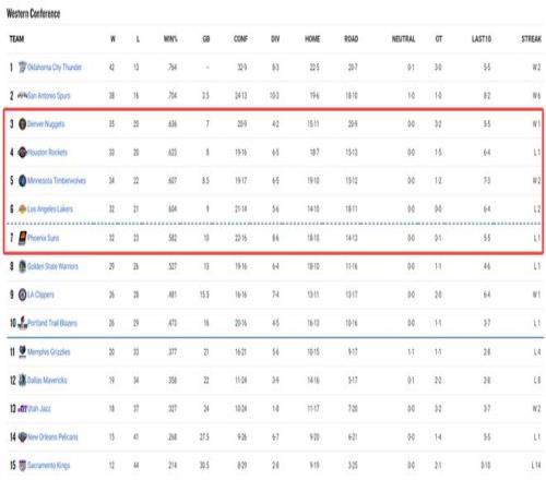 掘金、火箭、森林狼、湖人四支球隊(duì)的勝場差只有2個,掘金只領(lǐng)先火箭1個勝場,火箭只領(lǐng)先森林狼0.5個勝場。