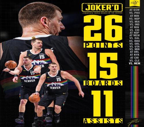 掘金一度領(lǐng)先灰熊15分但在末節(jié)兩次被殘陣灰熊縮小到1分,好在約基奇決勝時刻完成1攻1防,最終約基奇拿到26分15籃板11助攻完成生涯第184次三雙,掘金再度回到西部第三。