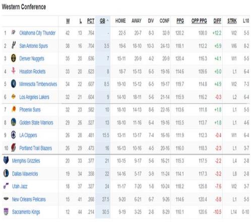 北京時間2月12日NBA常規(guī)賽打完,休斯頓火箭隊(duì)剛剛坐了一天的西部第三又下落到西部第四,而且掘金擊敗灰熊后跟火箭再度拉開了1個勝場差,雷霆則拿到2連勝,馬刺則拿到6連勝,兩支西部前二的球隊(duì)勝場差依舊是3.5個勝場。